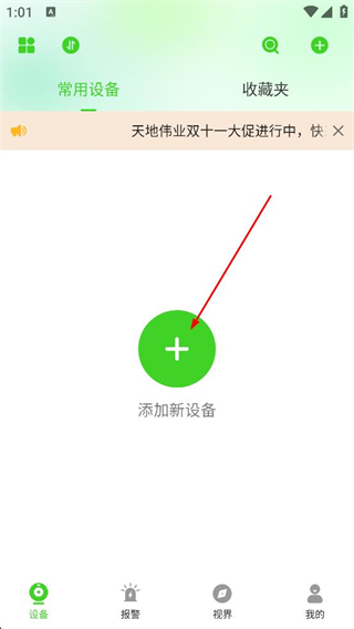 1、打開軟件進入設備頁面,查看常用設備及收藏夾內容,點擊加號按鈕選擇添加新設備,進入手動添加的設備添加流程。