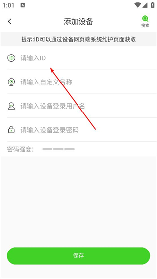 3、進入添加設備頁面依次輸入ID自定義名稱設備登錄用戶名及密碼,確認信息填寫完整后,點擊保存按鈕完成設備的添加。