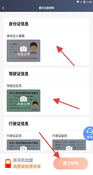 2、按照指引,上傳身份證信息、駕駛證信息、行駛證信息,再點擊提交材料即可。