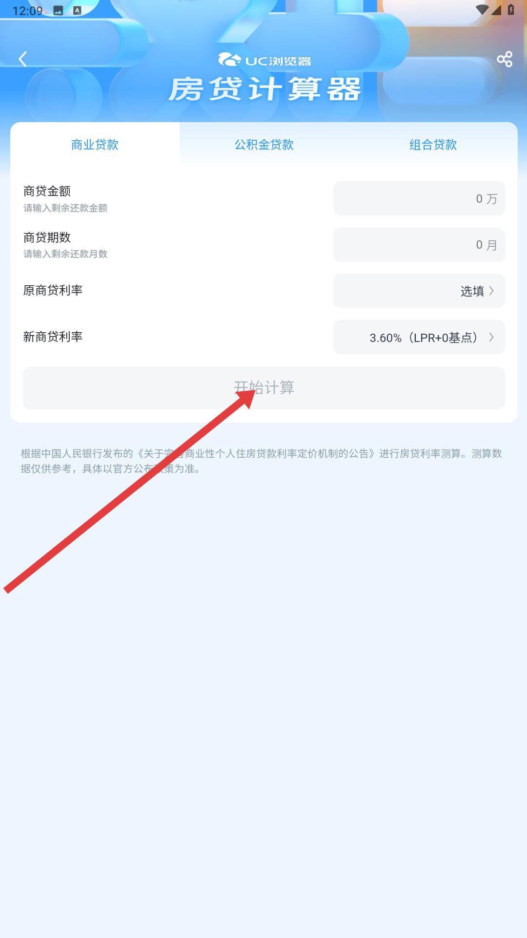 3、房貸計算器界面,輸入商貸金額、期數等信息,點擊開始計算,獲取結果。