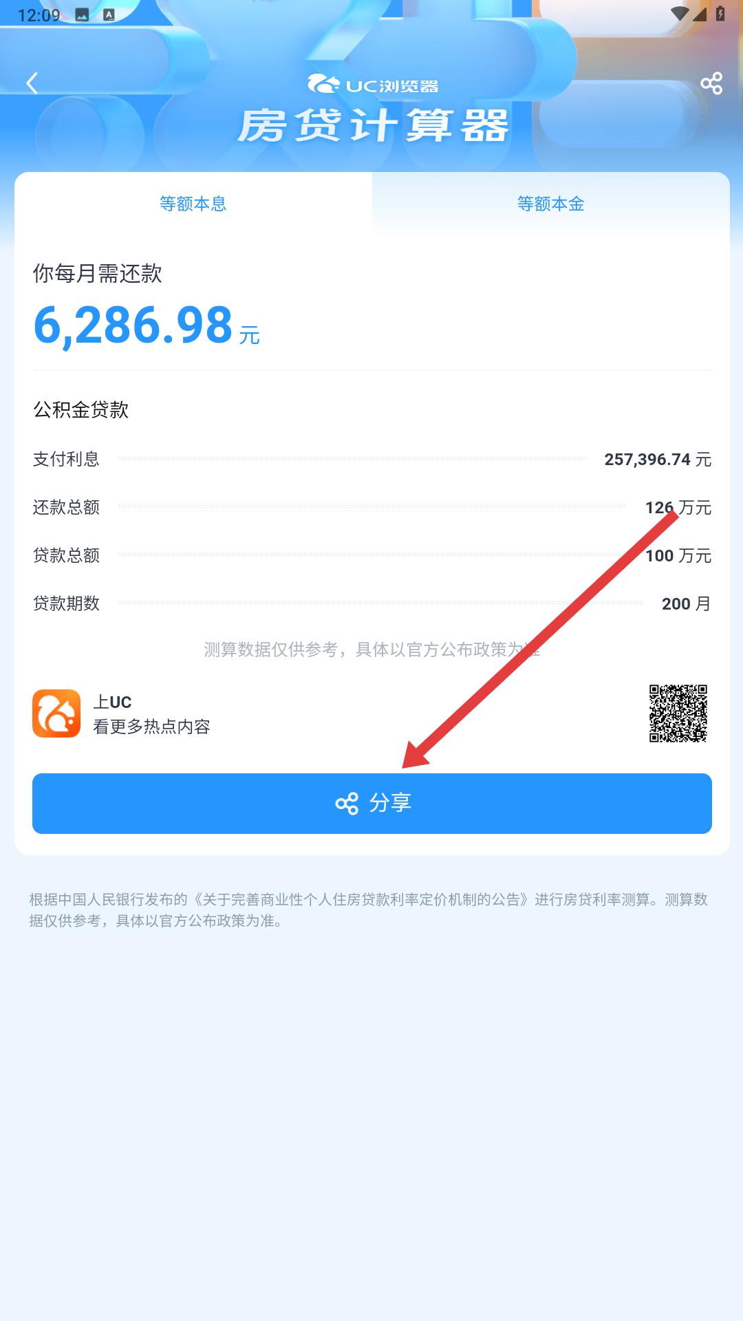 4、計算完成后,界面會顯示每月還款額等數據,點擊分享,可將結果分享出去。