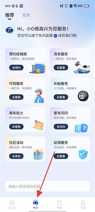 3、切換到服務板塊可看到預約經銷商、洗車服務、代碼服務等多種服務選項,點擊對應服務的去預約或去看看即可了解詳情。