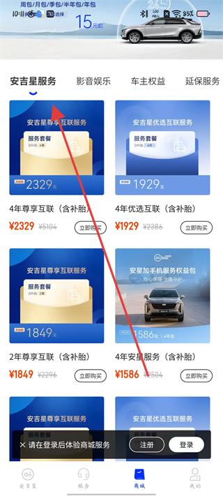 4、進入商城板塊可查看安吉星服務的多種套餐,如尊享互聯、優選互聯等服務套餐的價格和時長。