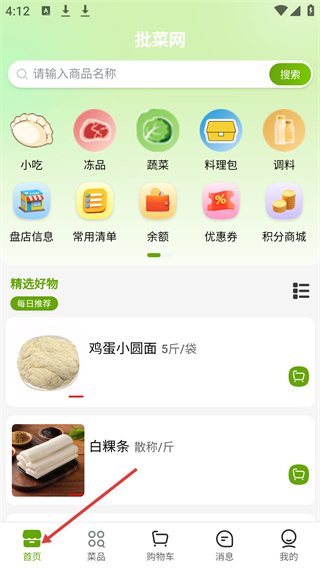 1、首頁有搜索欄方便找商品,分類含小吃、凍品等,還有盤店信息等功能,展示雞蛋小圓面等精選好物。