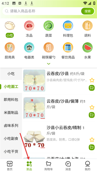 2、菜品頁分類豐富,涵蓋小吃、凍品等,展示云吞皮等多款小吃類商品,便于用戶挑選采購。