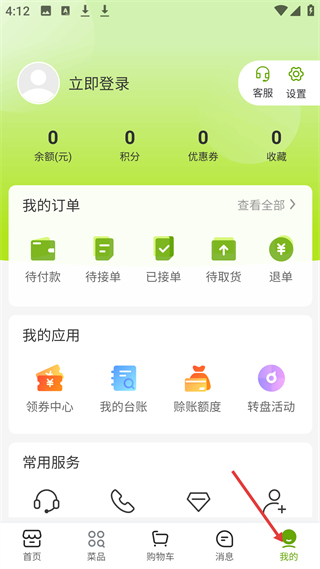 4、我的頁面可登錄賬號,查看余額、積分等,管理訂單狀態,還有領券中心等應用及常用服務功能。