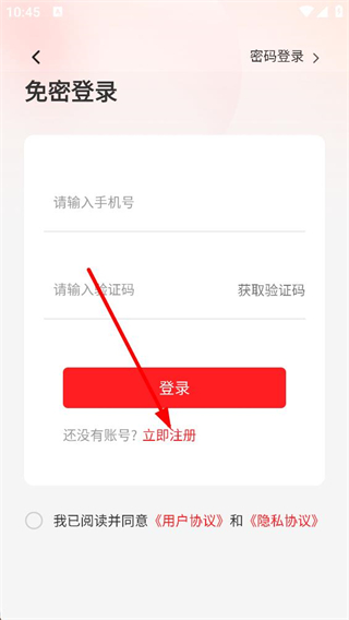 3、進入免密登錄界面后,可輸入手機號獲取并填寫驗證碼,若沒有賬號可點擊立即注冊選項,跳轉至注冊界面完成賬號注冊。