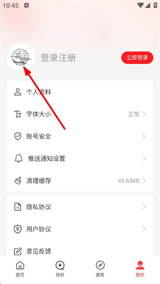 2、個人中心界面,能看到登錄注冊入口及個人資料字體大小等功能選項,點擊登錄注冊區域,可進入登錄界面選擇登錄方式。