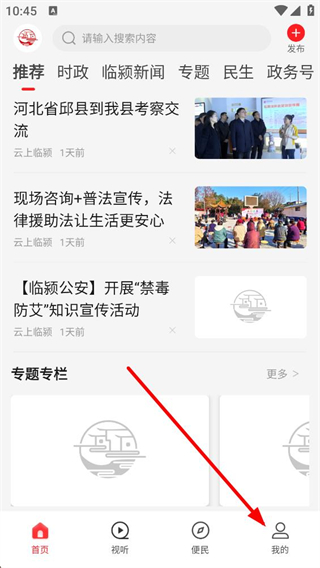 1、進入云上臨潁首頁,可查看推薦時政等板塊的資訊內容,點擊底部我的選項,即可進入個人中心界面,準備進行賬號相關操作。
