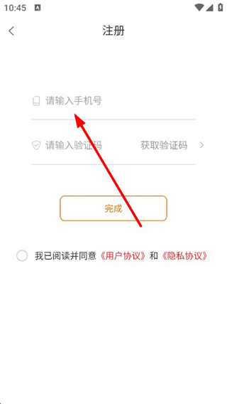4、注冊界面,依次輸入手機號獲取并填寫驗證碼,勾選同意相關協議后,點擊完成按鈕即可完成賬號注冊,以便使用更多功能。