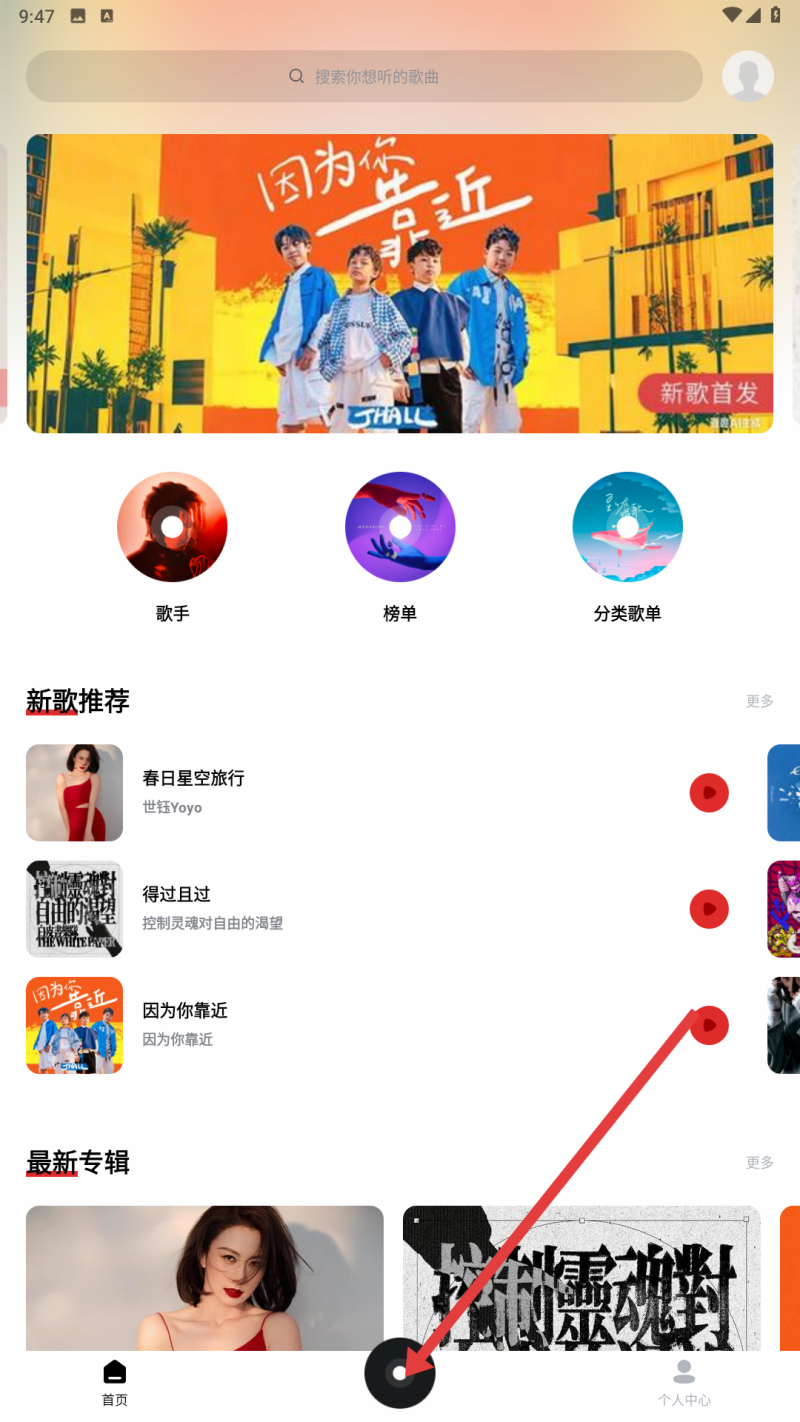 1、進入音樂APP首頁,可看到歌手、榜單、分類歌單等功能入口,還有新歌推薦和最新專輯展示,點擊想要播放的歌曲,進入播放頁面。