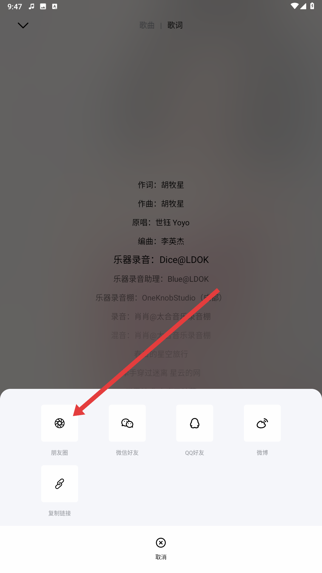 3、分享選項中,可選擇朋友圈、微信好友、QQ好友、微博等渠道分享歌曲,也可復制鏈接分享。