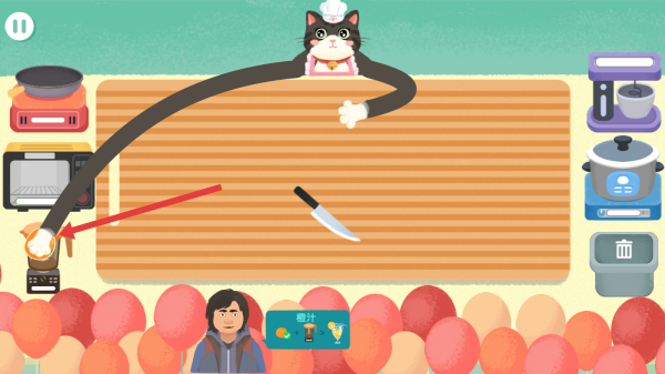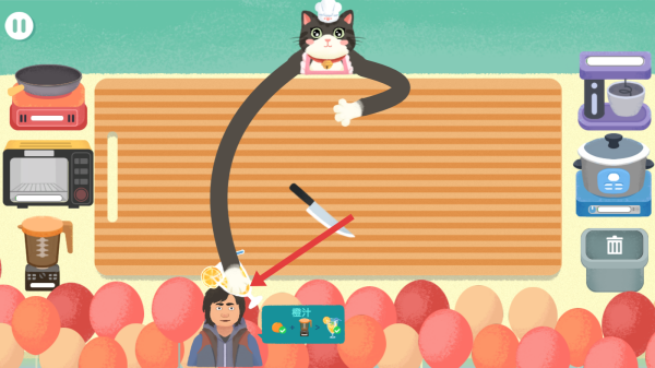 3、接著貓咪操作將處理好的原料等,配合刀具等工具,進行后續的橙汁制作步驟,推進菜品完成。