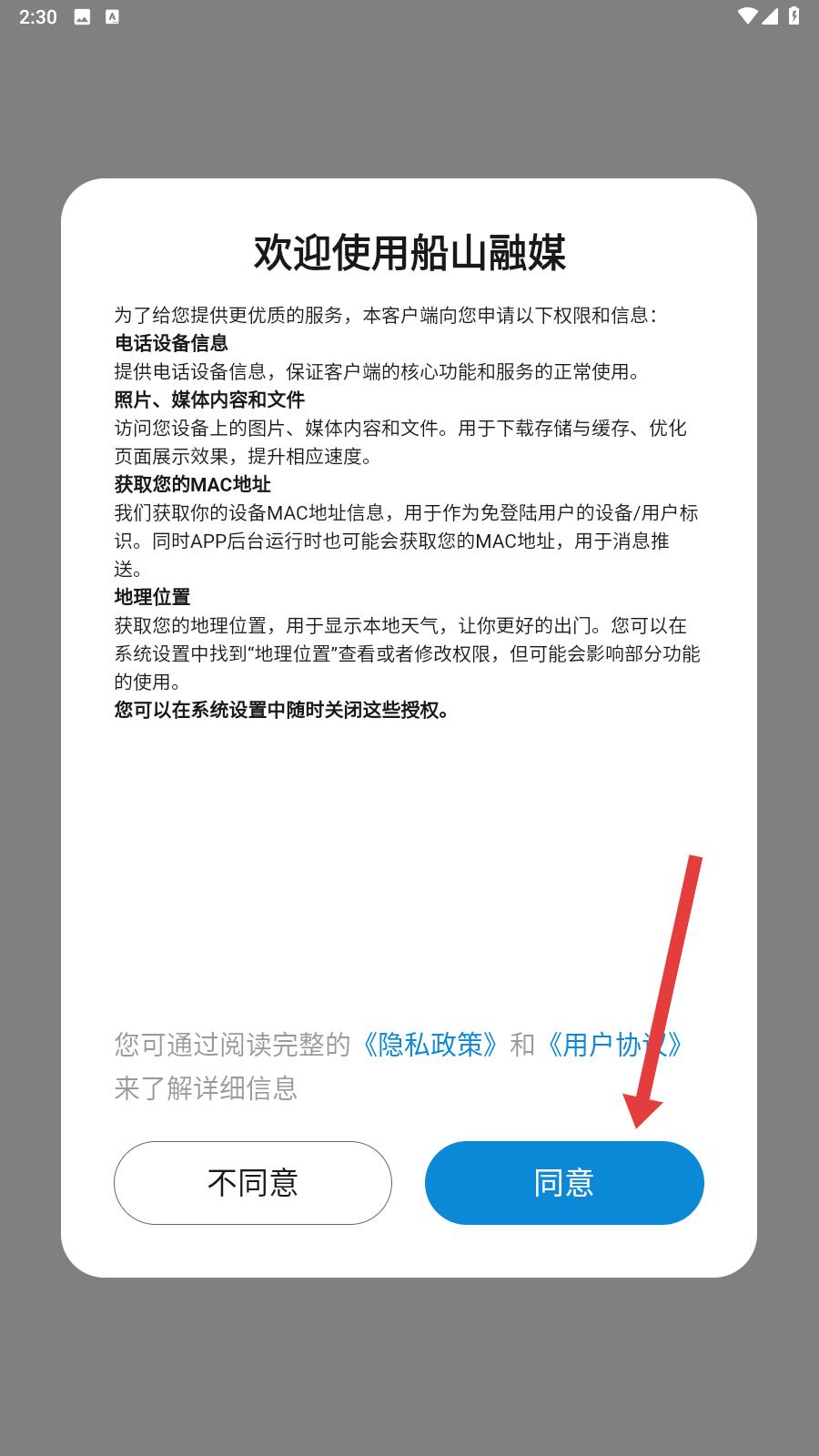 1、打開船山融媒App,在彈出的權限申請提示界面,仔細閱讀關于電話設備信息等權限說明后點擊同意鈕,以正常使用App功能。