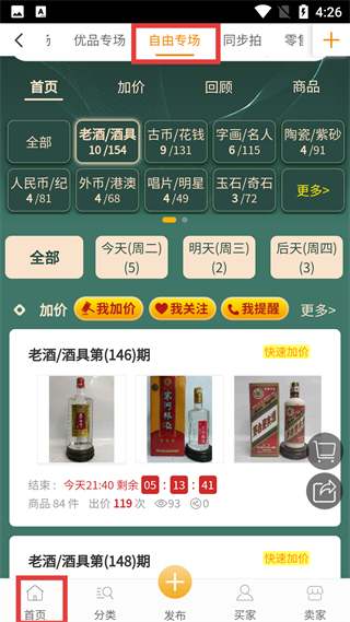 1、自由專場頁設老酒、酒具分類,展示老酒專場拍賣,標剩余時間、出價次數,可加價關注,底部有首頁欄。