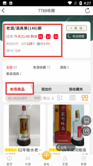 2、老酒專場詳情頁,展第146期拍賣,剩余5小時,商品85件,出價119次,可關注電話提醒,查看本場商品。