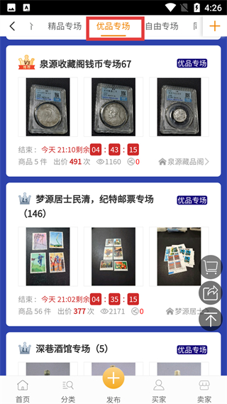 3、優品專場頁面,展示泉源收藏閣錢幣專場等拍賣,標注剩余時間、出價次數,有郵票專場等,用戶可參與優品收藏拍賣。