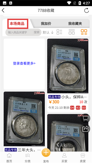 4、本場商品頁展示本場錢幣商品,如孫中山開國紀念幣等,用戶登錄后可查看更多,參與出價,底部有功能欄。