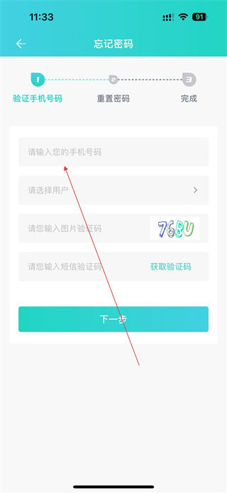 2、在忘記密碼頁面輸入手機號碼,選擇對應用戶,填寫圖片驗證碼后點擊獲取驗證碼,填入短信驗證碼,再點擊下一步進入重置密碼環節。