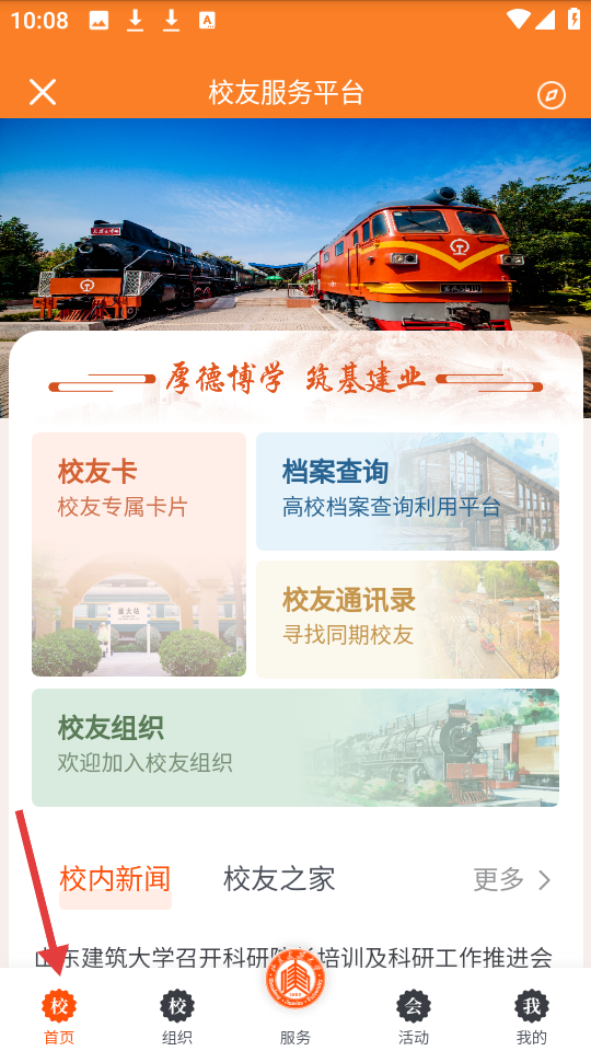 1、點擊校友服務平臺首頁背景有火車圖,展示校友卡、檔案查詢、通訊錄等功能,還有校內新聞等板塊。