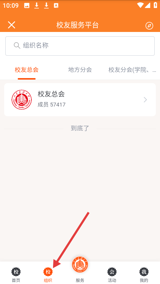 2、點擊平臺組織頁面可搜索組織名稱,顯示校友總會及成員數量,還有地方分會等選項。