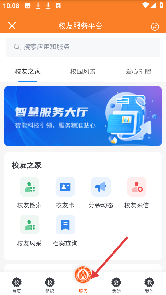 3、點擊服務頁面含搜索框,設校友之家、校園風景等板塊智慧服務大廳突出智能貼心服務。