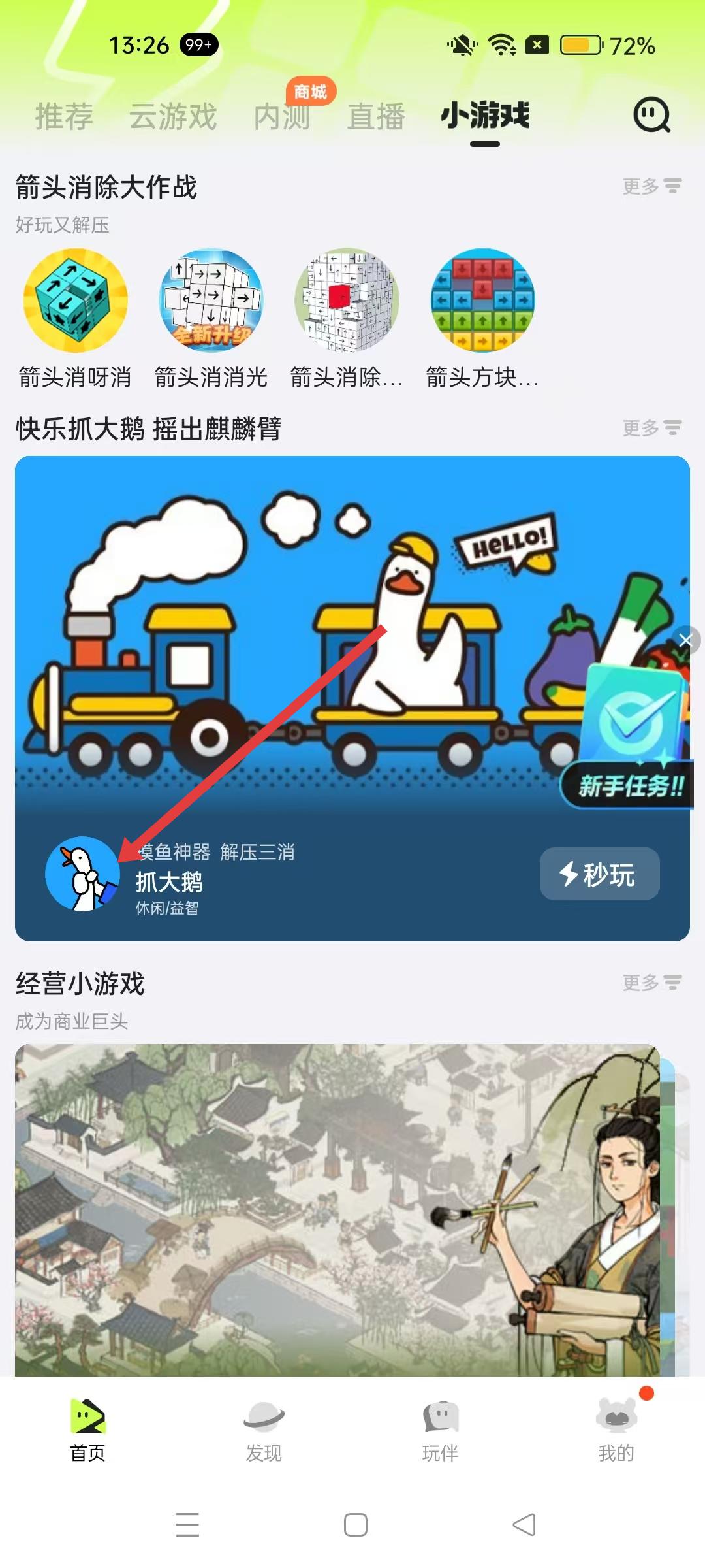 2、進入小游戲板塊,可看到箭頭消除大作戰、快樂抓大鵝等小游戲推薦,抓大鵝屬于休閑益智類,是摸魚解壓的神器。