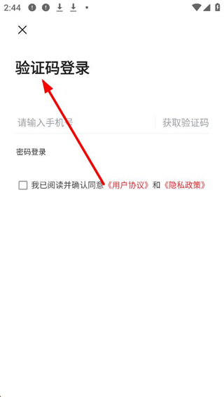 3、登錄界面,可選擇驗證碼登錄,輸入手機號獲取驗證碼,也可選擇密碼登錄,登錄前需勾選同意用戶協議和隱私政策。
