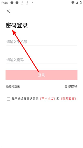 4、若選擇密碼登錄,輸入手機號和密碼后點擊登錄,若忘記密碼可點擊忘記密碼進行找回,登錄前需勾選同意用戶協議和隱私政策。
