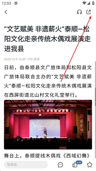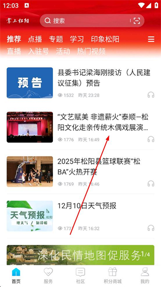 2、登錄后進入首頁可看到推薦的各類資訊內容,選擇感興趣的資訊,比如文化展演相關內容,點擊進入該資訊的詳情頁面。