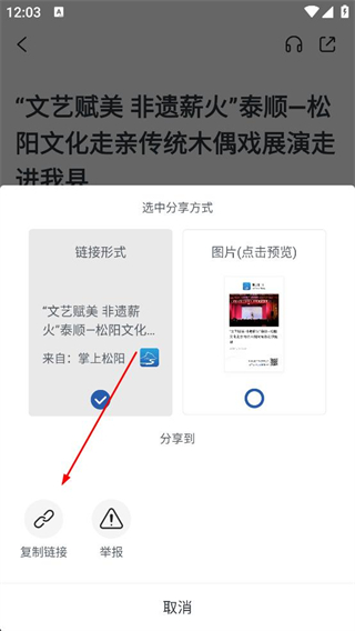 4、在分享界面中選擇鏈接形式或圖片形式,再點擊復制鏈接按鈕,可將該資訊鏈接復制下來,方便后續分享給其他對象。