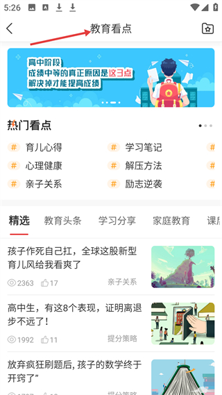 1、教育看點頁面,有熱門看點標簽,如育兒心得、心理健康等,還有精選文章,涵蓋親子關系、提分策略等多方面教育內容。