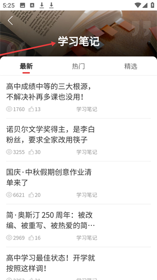2、學習筆記頁面展示最新筆記,有高中成績根源分析、諾貝爾文學獎相關等內容,為學習提供多元知識與思路。