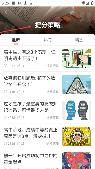 3、提分策略頁面最新內容包括高中生退步表現、數學學習方法等,助力學生找到高效提分途徑。