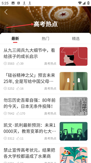 4、高考熱點頁面,最新文章有從閱兵看成長啟示、教育變革預測等,聚焦高考及教育領域熱點話題。