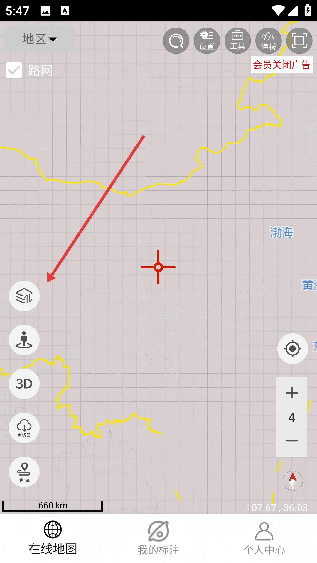 1、該軟件在線地圖界面可選擇地區、顯示路網,有設置、工具、海拔等功能按鈕,左側可切換圖層,調整地圖縮放比例。