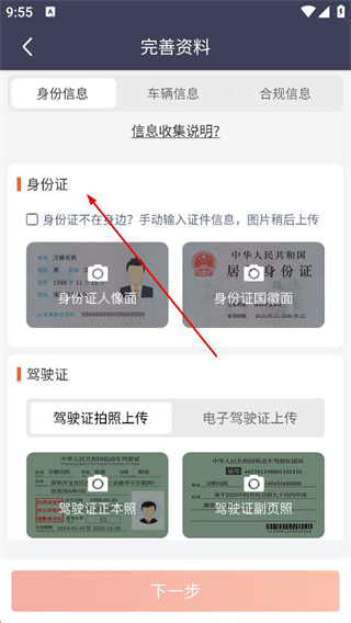2、切換至身份信息標簽頁,按提示上傳身份證人像面和國徽面照片,選擇駕駛證拍照或電子駕駛證上傳,完成后點擊下一步繼續操作。