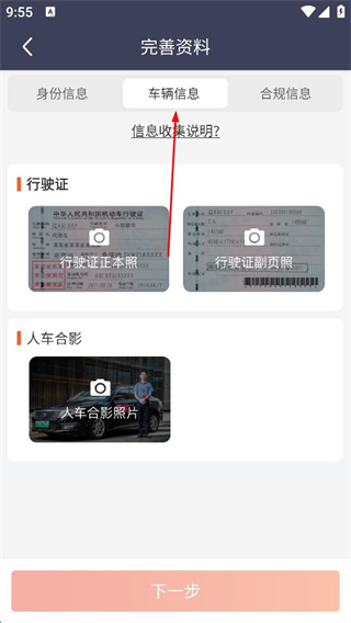 3、切換到車輛信息標簽頁上傳行駛證正本照和副頁照,拍攝并上傳人車合影照片,確認信息無誤后,點擊下一步進入合規信息填寫環節。