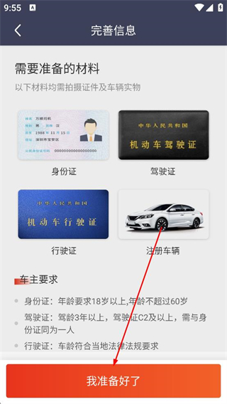 1、進入完善信息頁面,查看需準備的材料包括身份證駕駛證行駛證注冊車輛,確認車主要求后,點擊我準備好了按鈕進入完善資料環節。