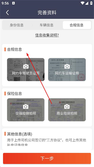 4、切換至合規信息標簽頁上傳網約車駕駛員證和運輸證照片,補充交強險和商業險的相關照片,按需上傳其他信息后點擊下一步完成提交。
