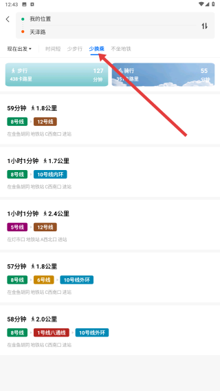 4、還能切換到少換乘等其他偏好,界面會同步更新對應的出行方案,方便根據需求選擇合適的出行方式。