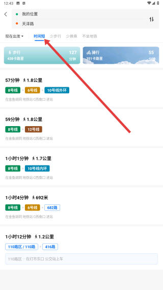3、進入路線規劃界面,可選擇時間短等出行偏好,下方會列出不同的出行方案,包含時長、距離及換乘等信息。