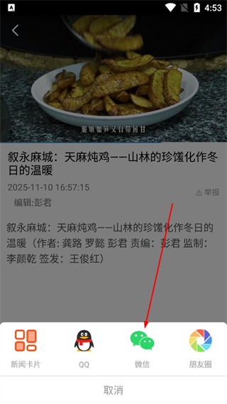 4、在視頻頁面點擊分享按鈕,選擇QQ微信等分享渠道,也可選擇朋友圈渠道,將視頻內容分享給更多人。
