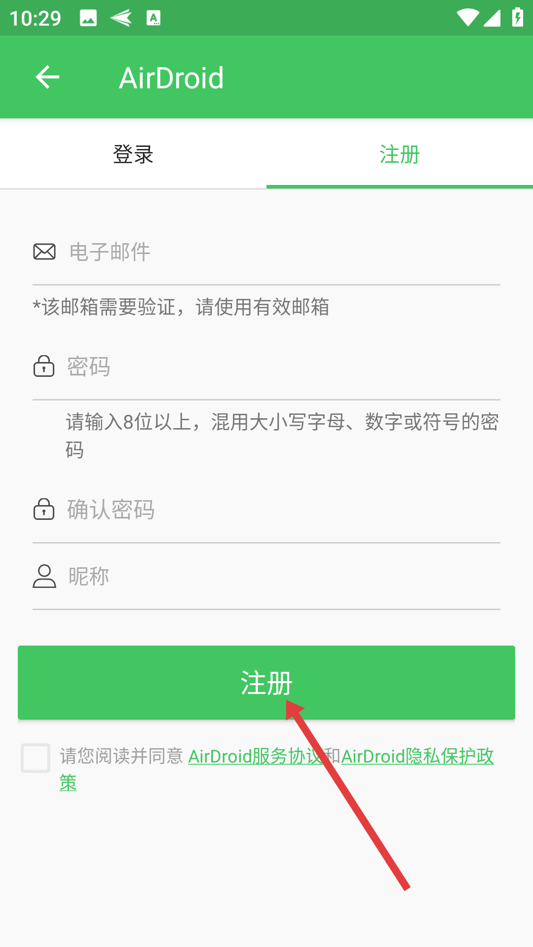 3、進入注冊界面在注冊標簽下,依次填寫電子郵箱、密碼、確認密碼、昵稱,勾選同意服務協議和隱私政策后,點擊注冊按鈕即可成功注冊AirDroid賬號。