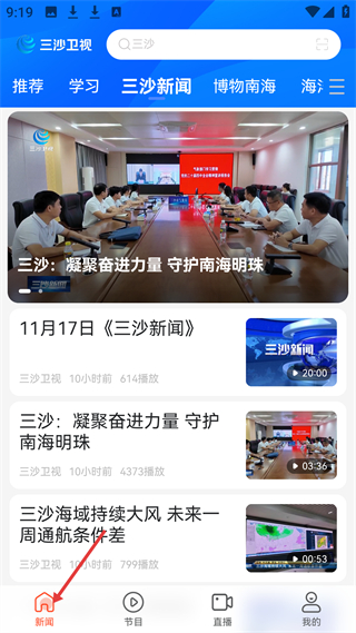 1、新聞板塊,展示三沙新聞相關視頻,有凝聚奮進力量守護南海明珠等內容,用戶可瀏覽三沙最新資訊。