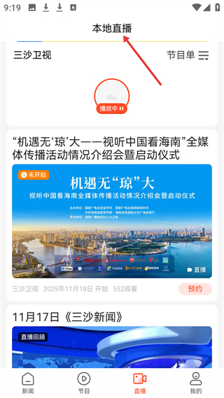 3、直播板塊有本地直播頻道,可看三沙衛視直播,還有機遇無‘瓊’大活動直播預約,用戶可實時觀看或預約直播。