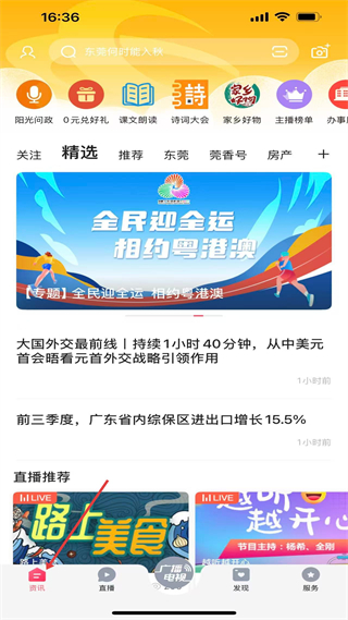 1、資訊板塊有陽光問政等功能,展示全運專題及大國外交、廣東綜保區資訊,還有直播推薦內容。