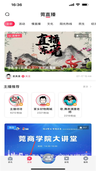 2、莞直播板塊含多分類,有直播東莞慢直播,推薦主播詩詩、家鄉好物商城等,還有莞商學院大講堂預告。