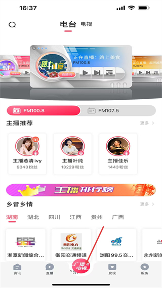 3、廣播電視板塊有電臺電視,直播路上美食等節目,推薦主播燕清、葉純等,鄉音鄉情涵蓋多省市電臺。