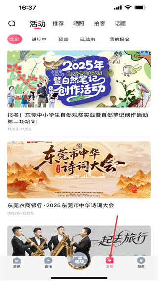 4、發現板塊有活動分類,展示東莞中小學生自然觀察實踐、中華詩詞大會等活動,支持報名參與各類文化活動。